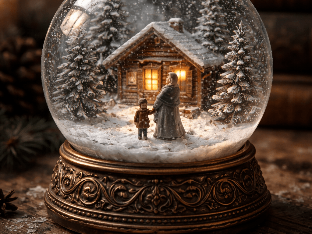 La esfera del salón muestra un porche. Una mujer y un niño. Sentados. Mirando hacia la chimenea. Dentro, un árbol. Luces. Calor.